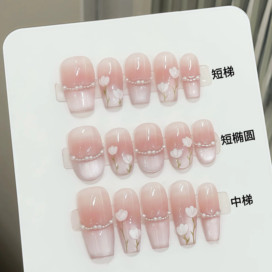 10pcs Hand-painted Tulip Fake Nail Patches Sweet Pink Pearl Cat's Eye Handmade Press On Nails Ins Simple False Nail For Summer