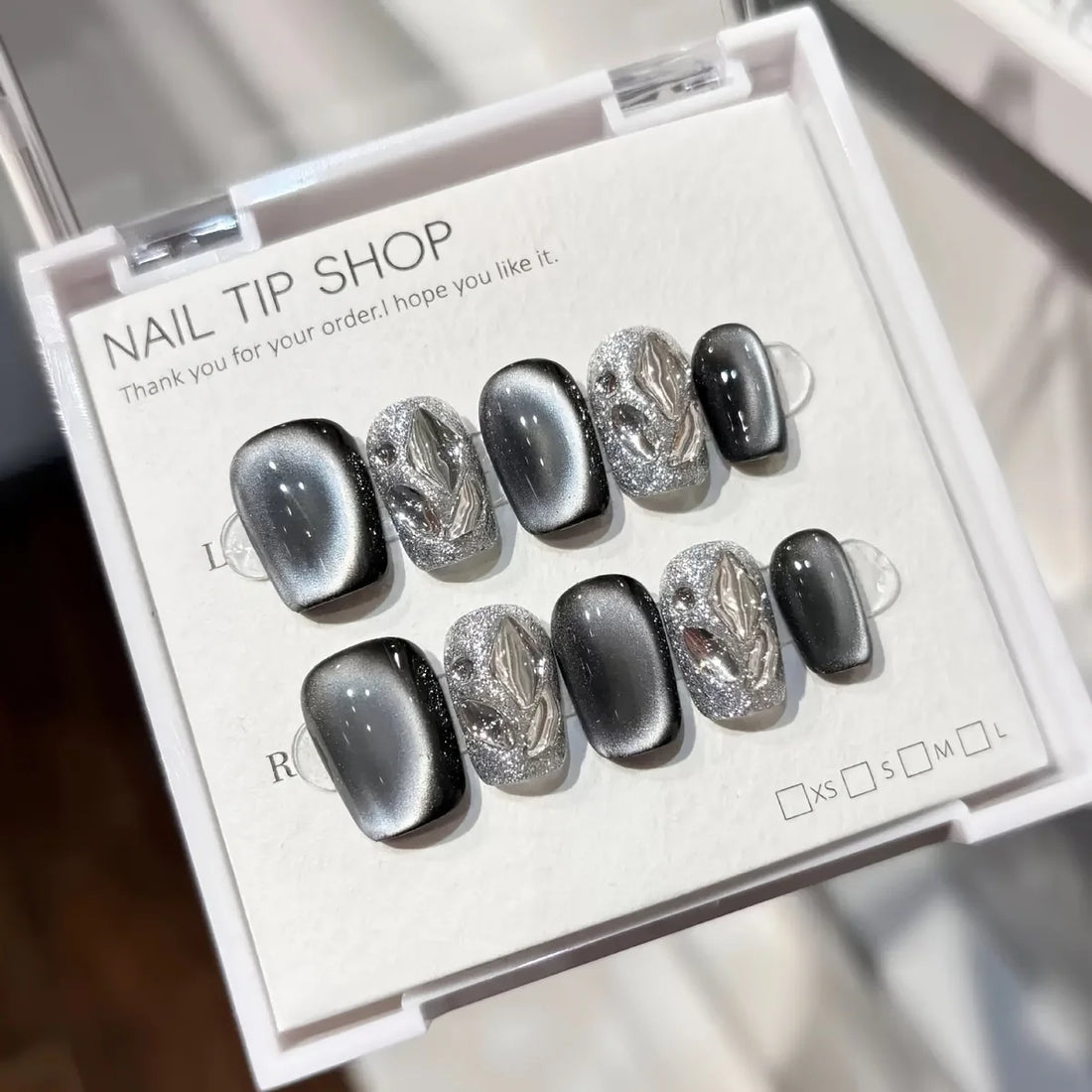 10pcs high-end Grey cat's eye small diamonds handmade fake nails, Short dark-colored nail decoration patches for girls