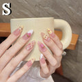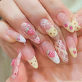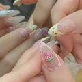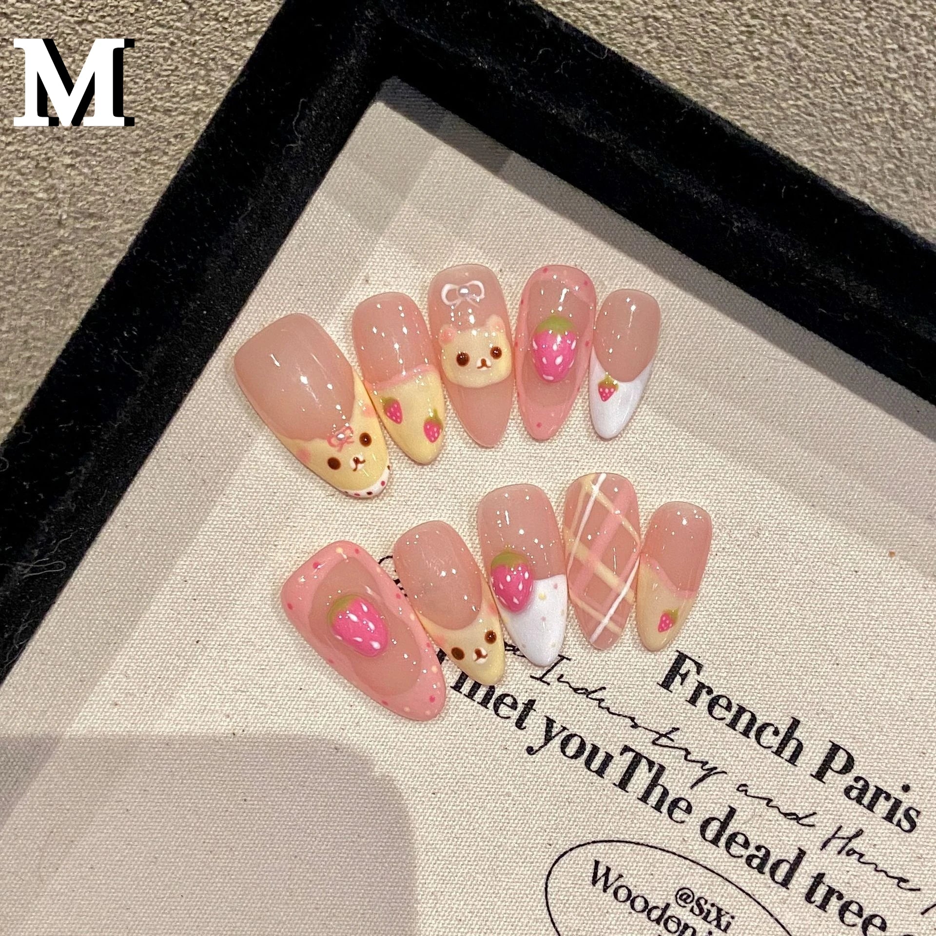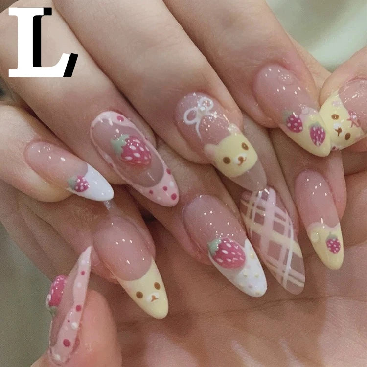 10Pcs Almond Press on Nails with Pink Strawberry Bear Design Acrylic False Nails Cute Full Cover Sweet Girl Wearable Nail Tips