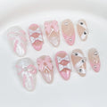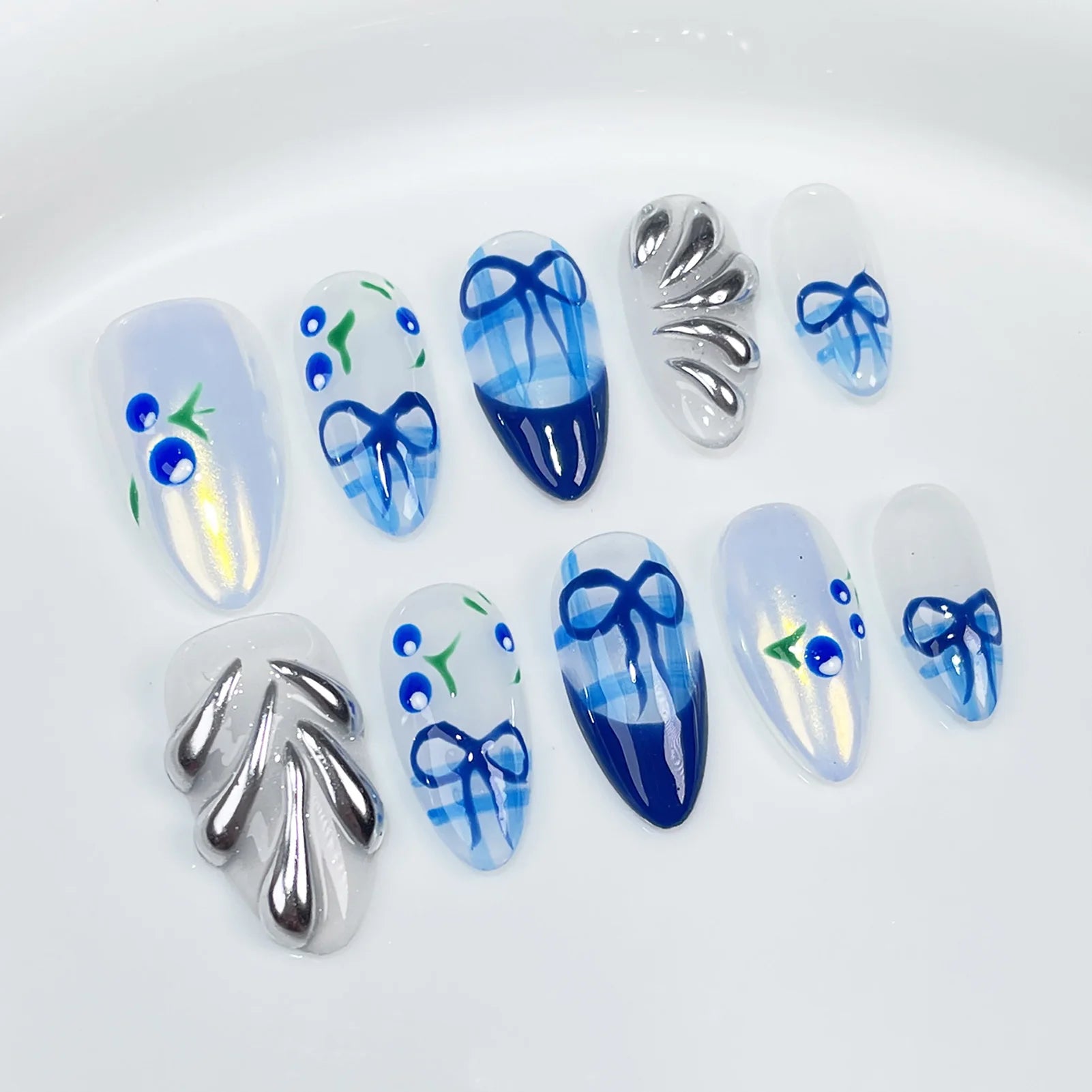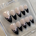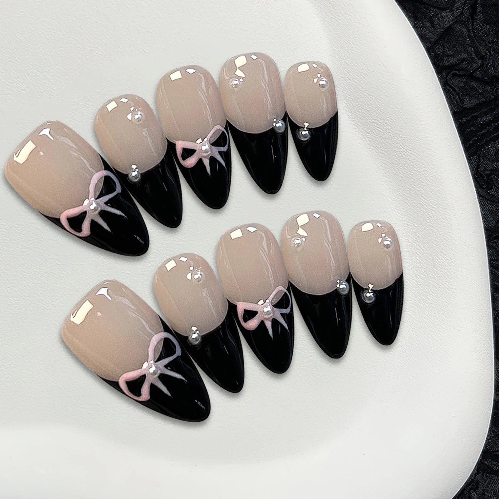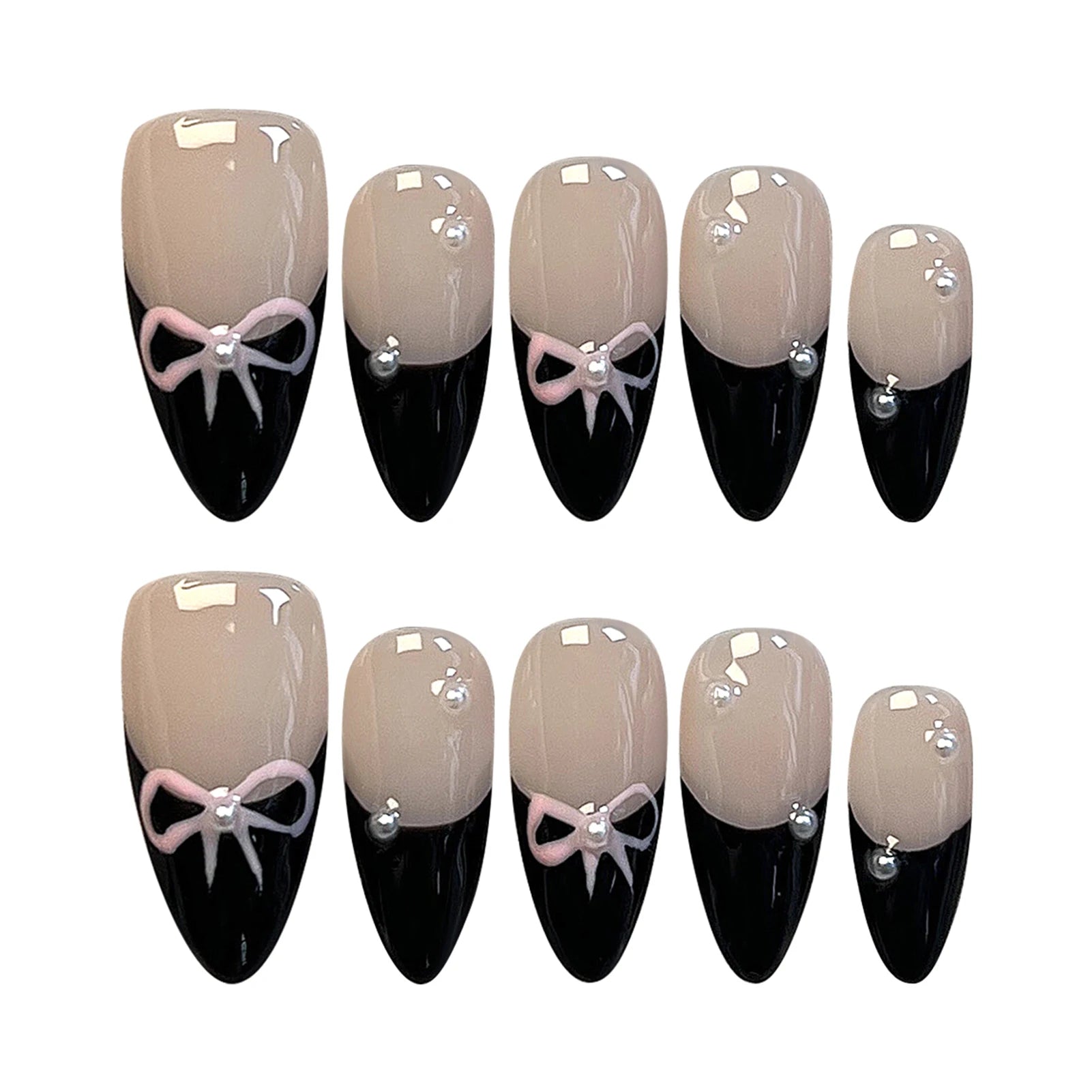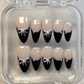 10pcs Black French False Nails Bowknots Designed Handmade Press On Nail Glossy Short Almond Wearable Fake Nail Patches Salon Art