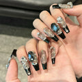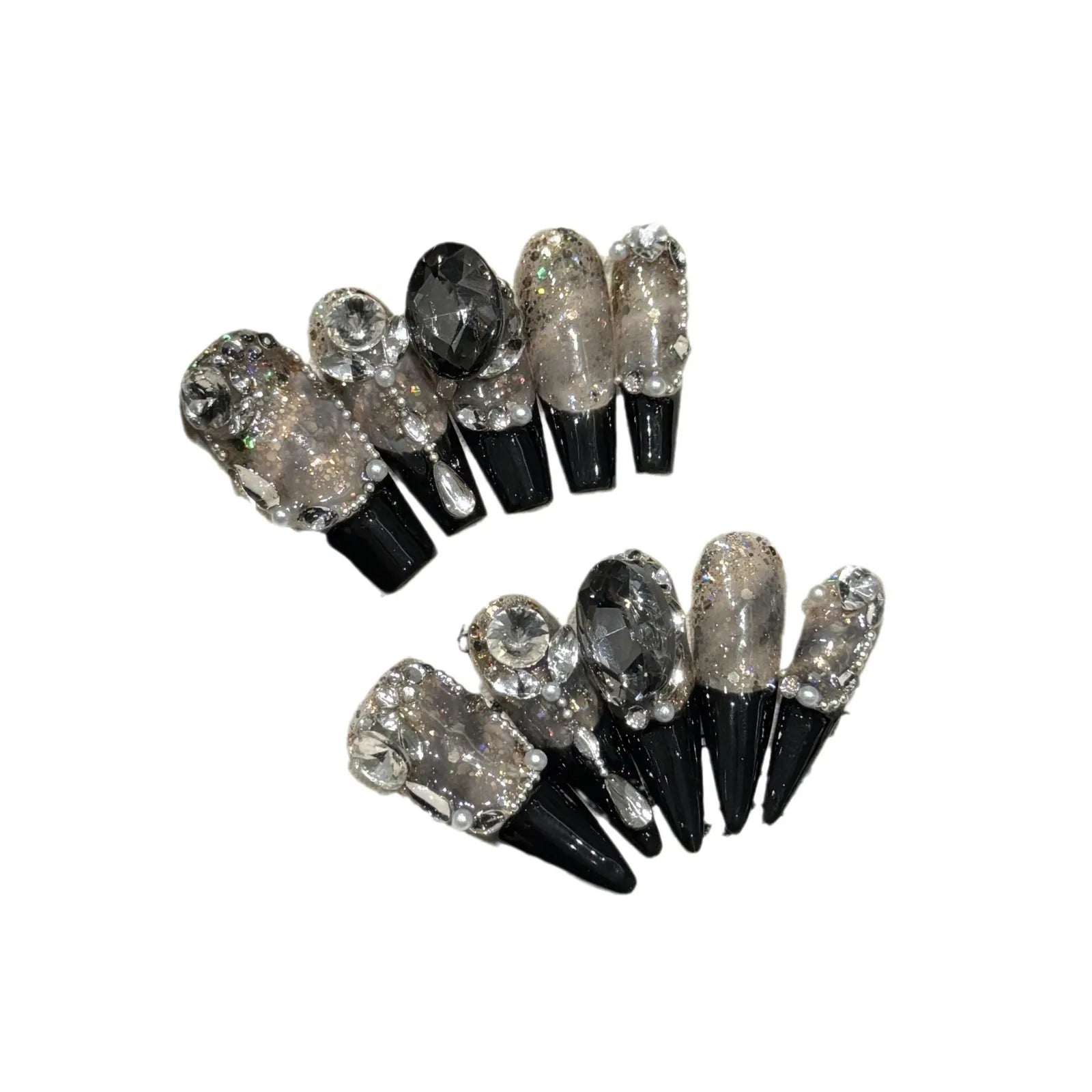 10pcs Black French Style Press On Nails Handmade Full Flash Rhinestone Decor False Nails Light Luxury Fake Nail For Hot Girls