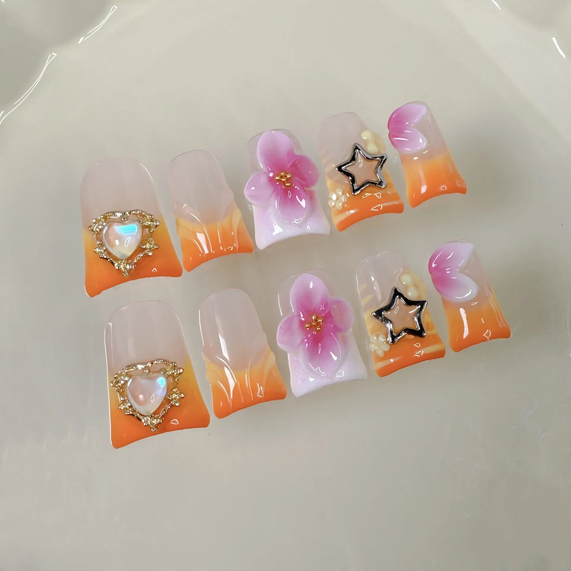 10pcs Handmade Press On Nail Gradient Vitality Orange French Style Fake Nails Y2k Star 3D Carving Flower Decor Summer False Nail