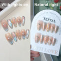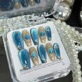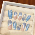 10Pcs Handmade Press on Nails Long Ballet Blue Fake Nails with 3D Ocean Moon Rhinestone Design False Nails Full Cover Nail Tips