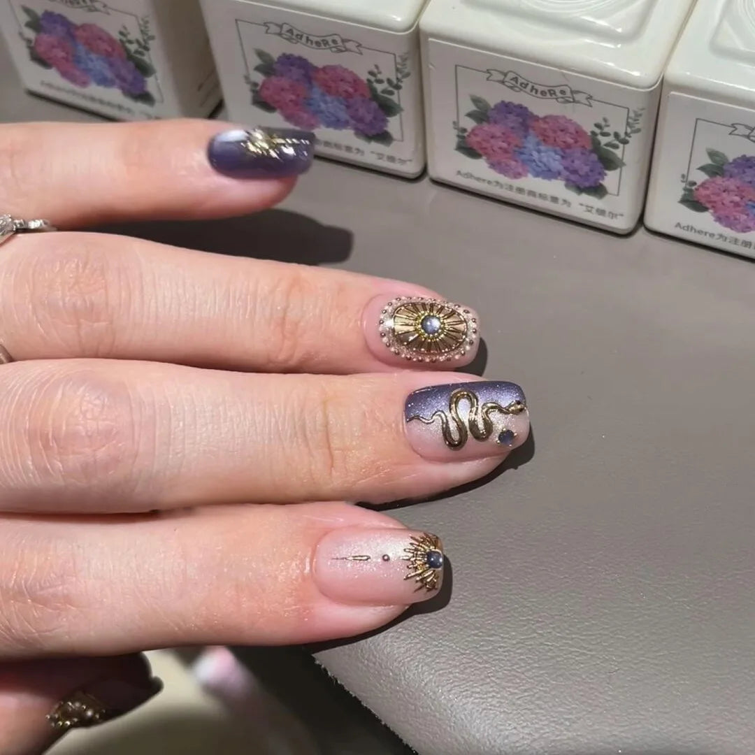10pcs Handmade Press on Nails Purple Flashing Magic Mirror with Diamonds Full Coverage Nail Tips for Women&Girl Removable Nail