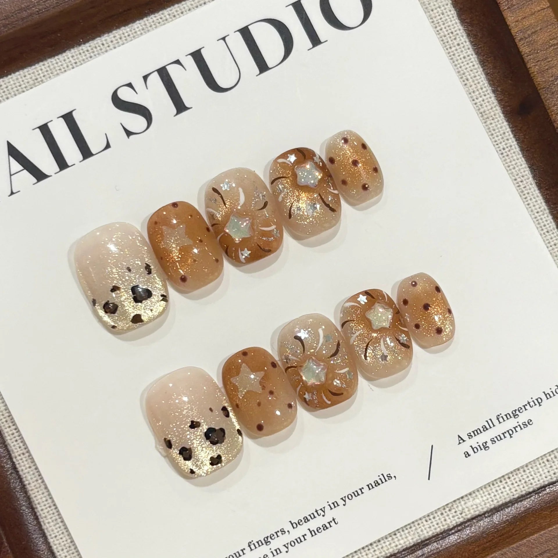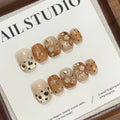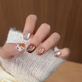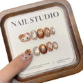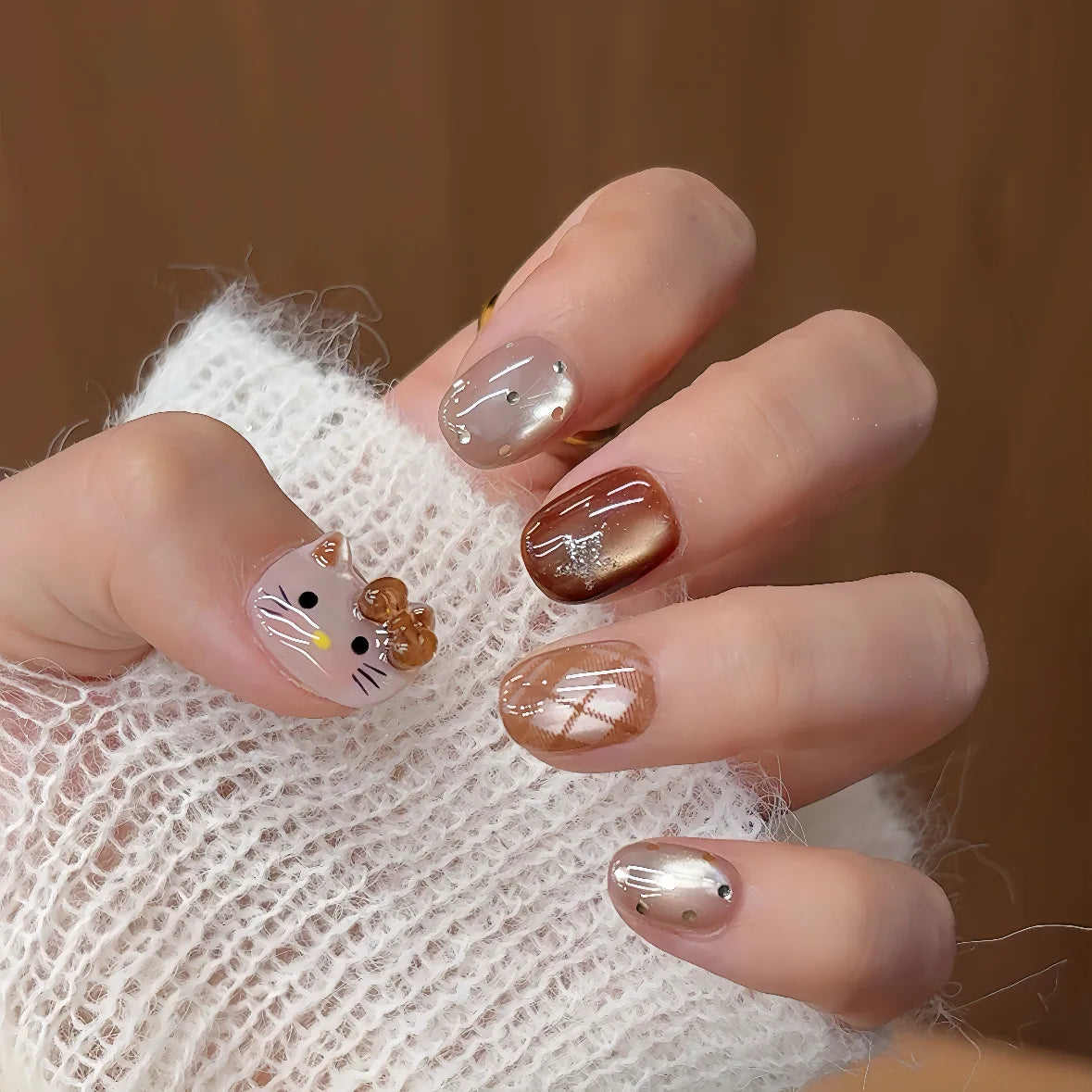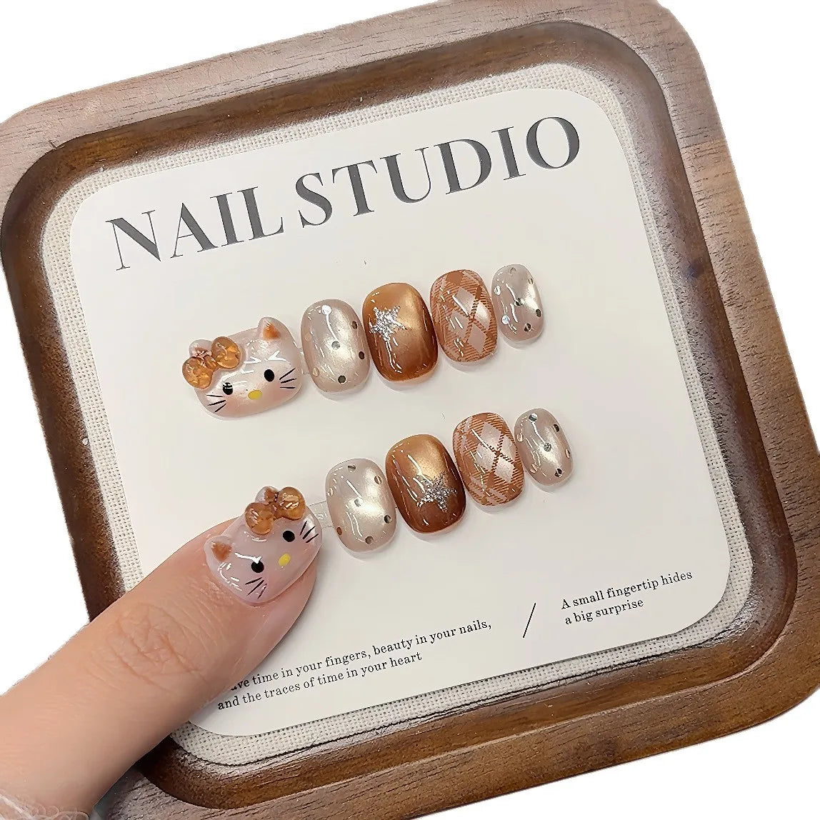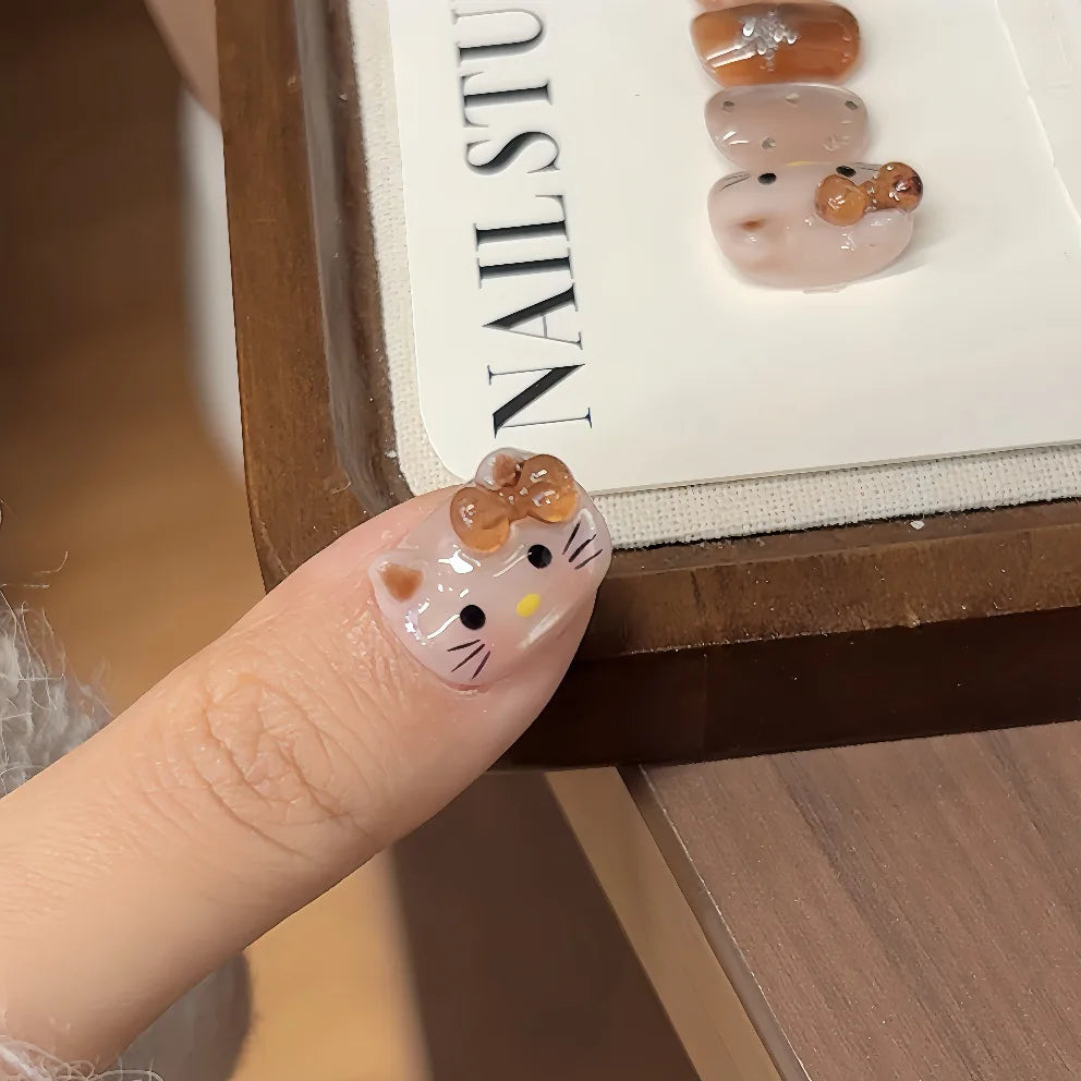 10PCS Summer BrownThe Polka Dot Cat's Eye Short Nail Art Hello Kitty Cute Notes Handmade Acrylic Fake Nail Gift