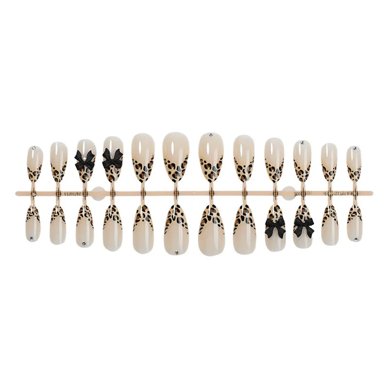 24pcs Almond-Shaped Nails Leopard Print Featuring a French Tip Design And 3D Bow Decor Glossy Full Coverage Press-On Fake Nails