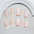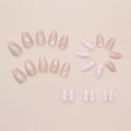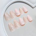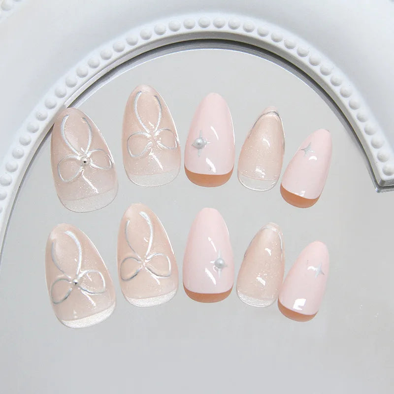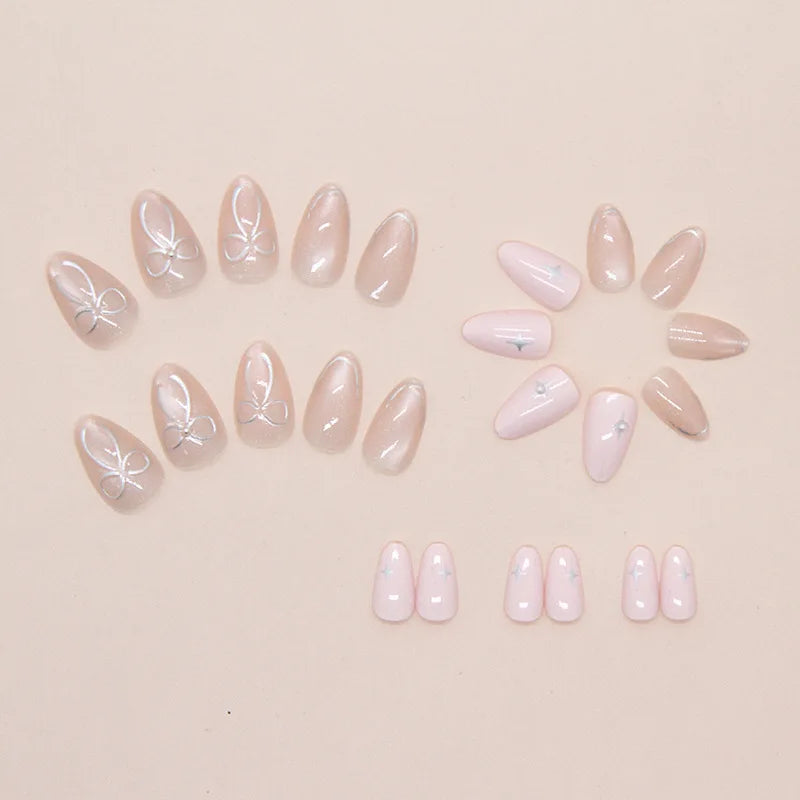 24Pcs Cat's Eye Design Fake Nail with Pearl Short Round Head Press on False Nails Silver French Bow Pattern Full Cover Nail Tips
