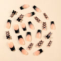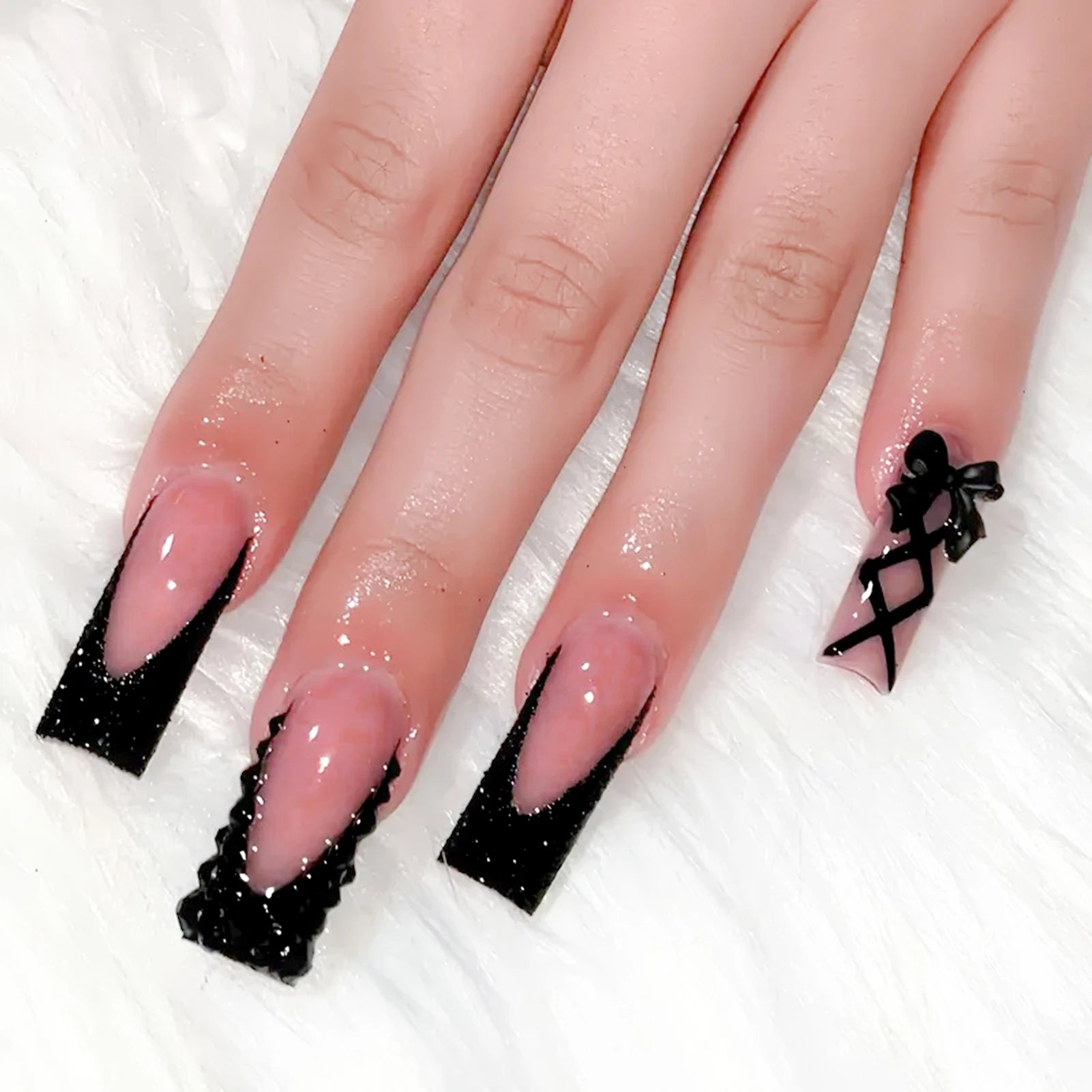 24pcs Long Ballet Press On Nails Black Cross Strap French Style Fake Naile With 3D Bowknot Decor Korean Reusable False Nail Tips