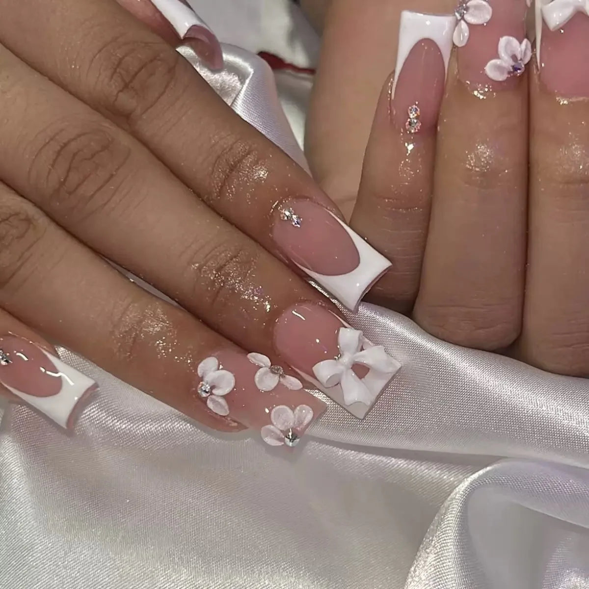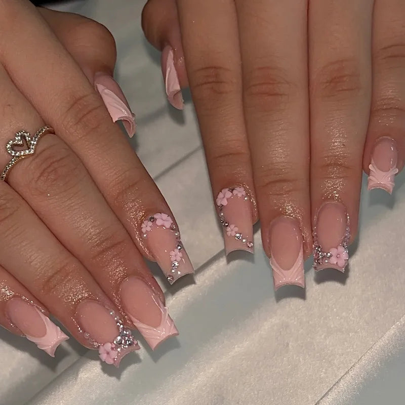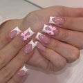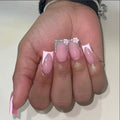 24Pcs Mid-length French Pink Square Head Press on False Nails Flash Drill Wearable Finished Manicure Full Cover Nail Tips
