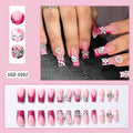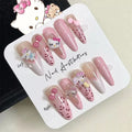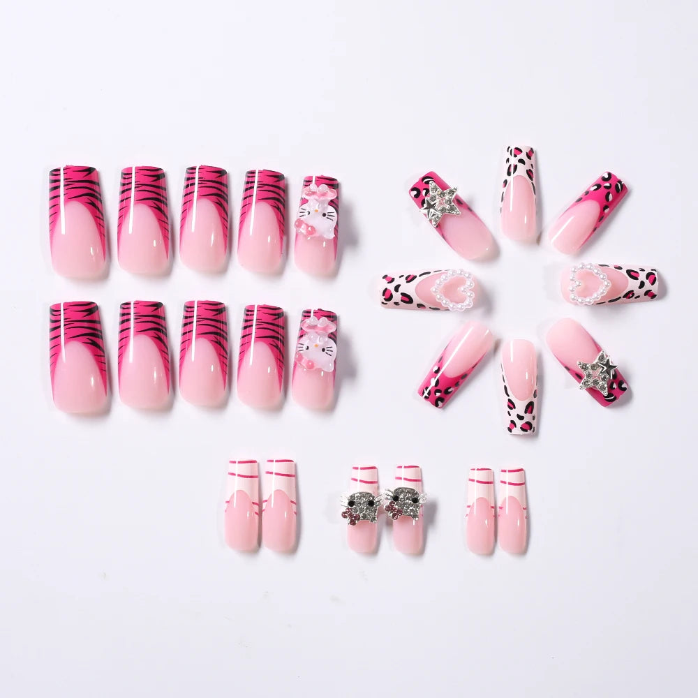 24Pcs Pink French Leopard Hello Kitty False nails 3D Y2k Star Heart Kitty Cat Rhinestones Press On Nails Cute Cartoon Fake Nails