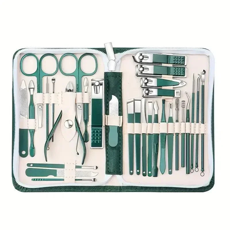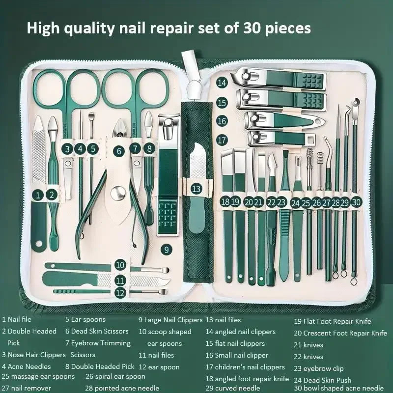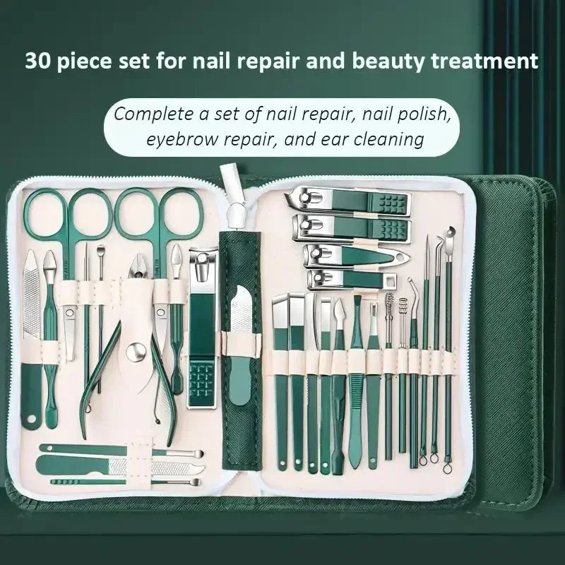 30pcs Professional Stainless Steel Nail Clipper Set Green Nail Tools Manicure Pedicure Set of 30pcs Travel Grooming Kit