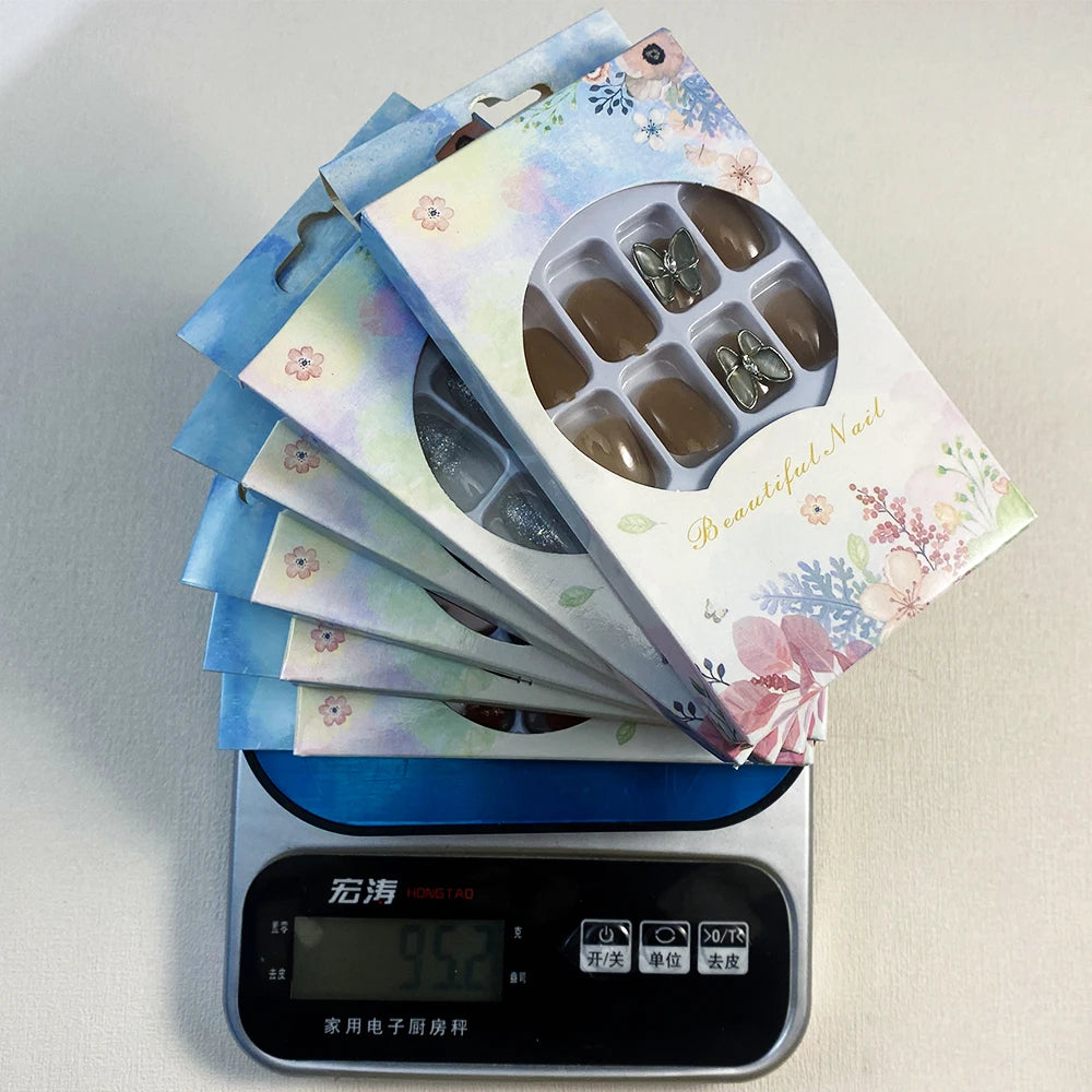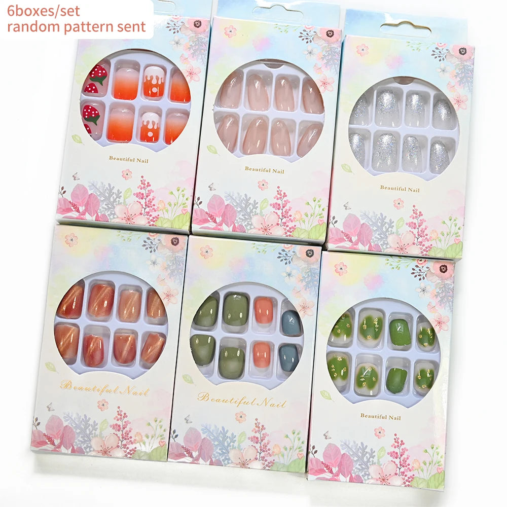 6 Boxes/set Press On Nails Full Cover Sweet Pink Red Short Round Head False Nails Manicure Wearable Nail Tips with Jelly Gel