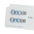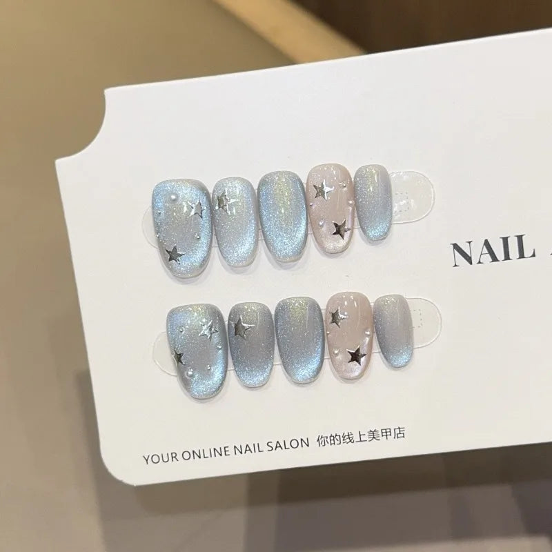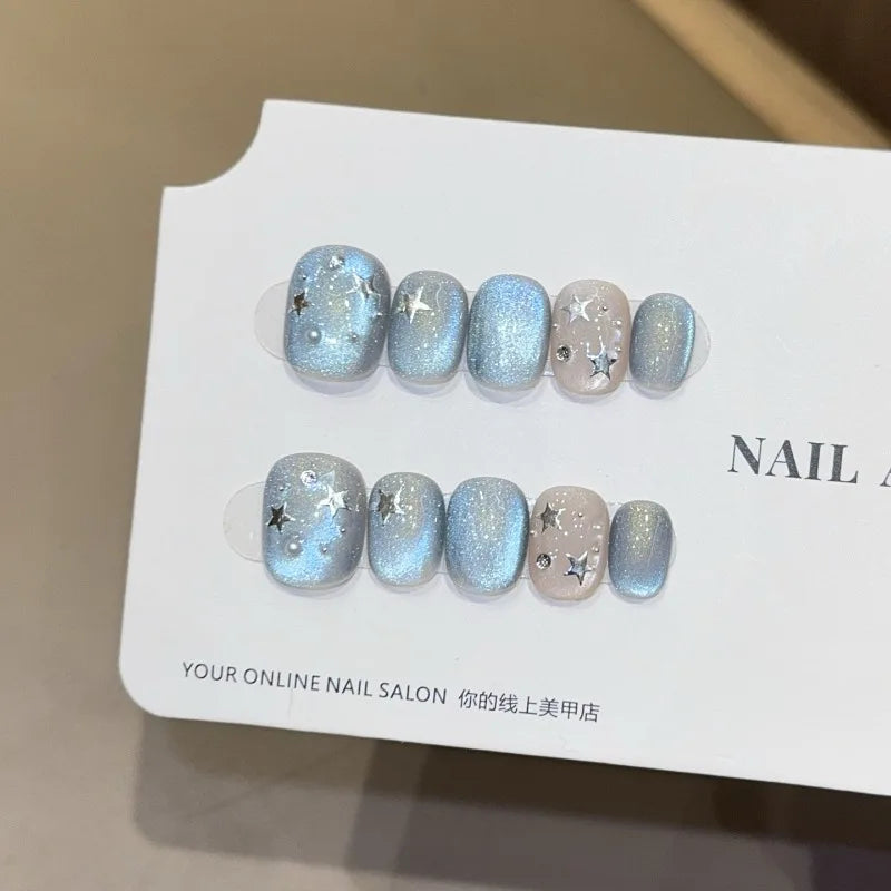 New 10Pcs INS Short Handmade Press on Nails Blue Cat Eye Star Fake Nails Wearable Stick-on Nails Full Cover False Nail